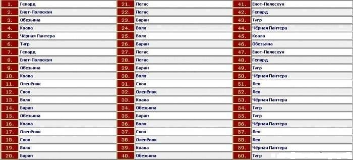 3. В таблице №2 найдите своего зверя (если сумма оказалась больше 60, вычтите из неё 60).