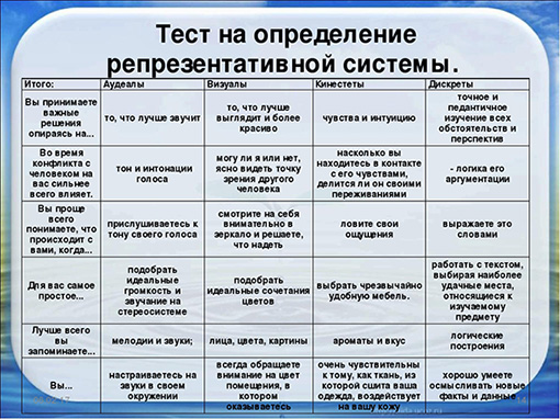 | Многие знают, что существует такое понятие как «Репрезентативная система» — преимущественный способ обработки, хранения и повторного воспроизведения ранее полученной информации. Имеются основные сенсорные репрезентативные системы: Визуальныая, Аудиальная и Кинестетическая. Однако, в последнее время различают помимо основных, еще и дискретную (дигитальную). Конечно, кроме этого существуют и прочие специфические системы, однако они очень слабо распространены, в отличие от дискретной, которая все больше и больше заявляет о себе.