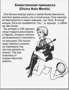 | Девушка с запросами. Требует всё и сразу. Полный пансион и систему «всё включено». Если у вас «девятка», а не «порш», вы не нижний, если нет счёта в швейцарском банке, вы не нижний, если вы живёте у чёрта на куличках, вы не нижний. Список требований к её рабу занимает не одну страницу формата А4, а посему и поиск подходящего нижнего затягивается на достаточно длительный срок. Суть Темы, понимает как обеспечение нижним её безоблачного и безбедного существования. Сессии может проводить только в старинных особняках, на худой конец на виллах, разумеется, где-то на островах, при этом необходимым атрибутом является бриллиантовое кольеу неё на шее и плётка у неё же в руках, инкрустированная хотя бы Swarovski. Наглая, самоуверенная, избалованная. Может оказаться «хорошей садисткой». Вниз уйдёт при исключительной ситуации, когда бонус за пребывание в роли рабыни окажется выше её самых смелых мечтаний и требований (по сути никогда).