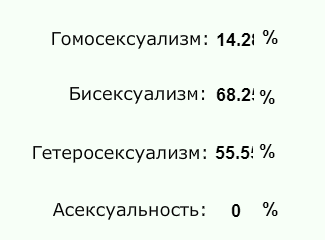 Пояснения В 1948 году Альфред Кинси (Alfred Charles Kinsey) с соавторами предложили шкалу для самоидентификации сексуальной ориентации, известную как «шкала Кинси» – The Kinsey Scale. Шкала Кинси представляет собой один вопрос с семью вариантами ответов. Конструкция указанной 7-членной шкалы представляет собой одномерный континуум, с крайними делениями, отражающими гетеросексуализм и гомосексуализм. В 1978 году Фриц Кляйн (Клейн) (Fritz Klein) предложил «решётку сексуальной ориентации» – Sexual Orientation Grid, которая развивала идеи, заложенные в шкалу Кинси, и содержала 21 вопрос. В 1980 году Майкл (Мишель) Стормс (Michael Storms) предложил свою шкалу сексуальной ориентации, шкалу Стормса – The Storms Scale. Эта шкала отражает 2-х мерность сексуальной ориентации. Гетеросексуализм и гомосексуализм это разные типы поведения, которые могут присутствовать одновременно у одного человека, они могут измеряться отдельными шкалами, а различная выраженность этих свойств представляет собой ту или иную степень бисексуальности. Возможно Майкл (Мишель) Стормс исходил из известного положения Зигмунда Фрейда о врождённой бисексуальности человека, которая в зависимости от условий среды, проявляет себе как различная степень гетеросексуальности, бисексуальности или гомосексуальности. Говоря шире – человек поли-сексуален, т.к. существуют и такой тип сексуального поведения как зоофилия (скотоложство). Если говорить о типах сексуального поведения, то здесь выделяются как самостоятельные типы: гетеросексуализм, гомосексуализм, бисексуализм и асексуальность. Соответственно правомерно измерение выраженности всех 4-х указанных типов поведения. Здесь предлагается 4-х мерная модификация «решётки» Кляйна в виде 21 вопроса, которыми измеряются 4 параметра сексуальности, отражающие 4 типа сексуального поведения: гетеросексуализм, гомосексуализм, бисексуализм и асексуальность. http://www.psi-test.ru/sex/Klein-Grid.html кто нам напишет свой результат? |