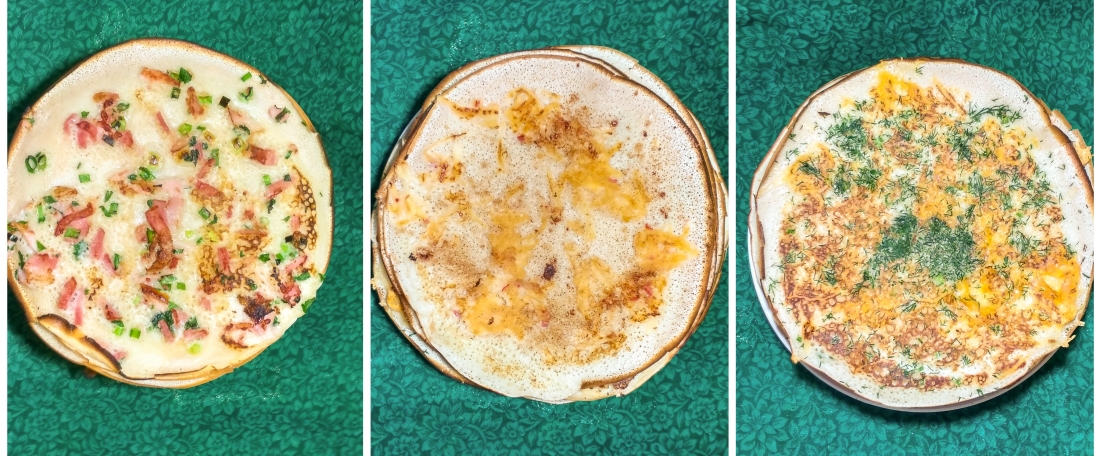 Готовится любой любимый рецепт блинного теста. Мелко рубится выбранная начинка. И в процессе когда на сковородку наливается блин, и он ещё не схватился, его посыпают выбранными ингредиентами, получается с одной стороны обычный блинчик с другой он с припеком с "начинкой". Начинка может быть разная, мясная, грибная, зелень, яблоки, сыр и тд... Сегодня решила сделать с беконом с зелёным луком, сыр с зеленью и яблоки с корицей и ванилином) |