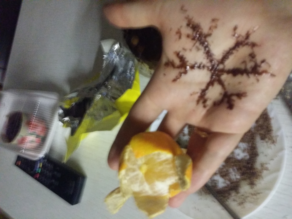 Чтобы шоколад смотрелся презентабильно, его пришлось потереть на тёрке, а чтобы прилип ровными линиями, пришлось снежинку сначала нарисовать маслом, и только потом посыпать шоколадной крошкой)