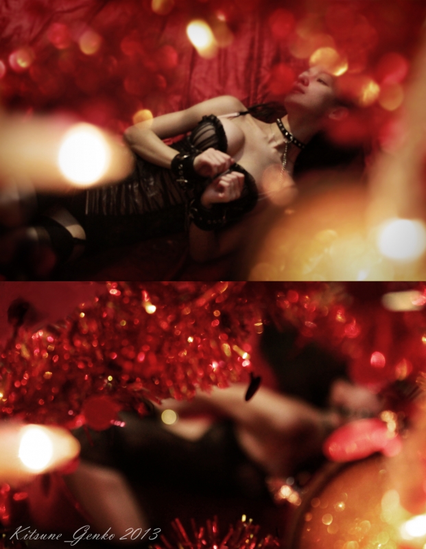 Только дыхание... Спокойное и ровное,едва ли уловимо поднимая грудь и обнажая ровные ряды ребер под бледной кожей.Почти не двигается.Ибо каждому движению вторит тонкое плетение нити,обернувшей все девичье тело.Веревка терлась и натягивалась при каждой попытке шелохнуться,мешая легкое жжение с холодом скованности.Оплетая запястья,предплечья,вязалась узелками за спиной,на груди,обхватывала бедра и уходила к самым щиколоткам.Под ногами нет опоры,ровно как и где-либо еще,полностью оставляя в прострации.Паутина веревок по всему телу путала в неопределенном состоянии,заставляя в голове метаться мысль о беспомощности. Мнимое спокойствие.Напряжение и страх держат гораздо сильнее веревок.Неизвестность перед следующим мгновением,вытягивая секунды в вечность ожидания.Что будет дальше?Боль или удовольствие?Сколько она еще так продержится?Или ее продержат?От каждой мысли на один удар сердца больше,постепенно наращивая темп.Она уже слышит,как стучит.И как пронзает тишину собственное мерное дыхание.Только не сорваться... Момент.Едва ли не содрогась от случайного прикосновения.Чужая рука теплым контрастом скользнула по прохладной коже,проходясь от ключицы до подбородка,приподнимая за него голову.Остается лишь покорно поднять лицо,следуя этому жесту,и невидяще направить вверх взор,застланый темной повязкой.Смотрит?Как бы ей хотелось сейчас заглянуть в Его глаза.Но вместо этого лишь темнота,меж тем обостряя ощущения...Еще жест,скользнув назад к груди обеими руками и опускаясь на ее уровень.Чувствует мерное дыхание на своих губах,угадывая близкое расстояние.И доходя до предела в невозможности дотянуться до желаемого.Ощущая слабое прикосновение к груди,слегка поглаживая,заставляя тело встрепенуться,растягивая секунды ожидания...Затем колко обрывая ласку и отдаляясь. -Нравится?-спокойный тон,обезличено задавая вопрос,будто интересуясь чем-то вполне обыденным.Следом обойдя и остановившись с другой стороны,колыхнув воздух вокруг.-Впрочем...-пальцы легко прошлись по промежности,смазывая влагу с кожи.-Я вижу. Обжигающее чувство стыда захватило девичье сознание.Тело скажет обо всех потаенных желаниях,когда разум будет хранить тайну.Как непривычно.Оказываясь перед кем-то в таком состоянии,без всякой возможности выразиться.В тоже время открывая себя полностью.Все существо сжалось в каком-то ощущении паники от упущенного контроля,доли вины от несдержанности и потерянности в отсутствии попытки сделать хоть что-то.От того опуская голову и смущенно закусывая губу.Подобное не могло пройти незамеченным.Улавливая чужие эмоции Он потянулся к веревкам.Крепления ослабли и через пару мгновений она почувствовала холодный пол,опускаясь на колени.Шелком скользнула повязка.Даже к полутемному помещению пришлось привыкать после долгого прибывания в полнейшем мраке.Хлопая медленно глазами,выискивая тут же единственный силуэт.И найдя,уже не сводя с Него взора,опасливо косясь куда-то вниз.Понимая,что Он остановился прямо перед ней,не смела взглянуть и опускала глаза,то ли в страхе,то ли в смущении. -Посмотри,-реакция не заставила ждать,и она обратила к нему лицо,заглядывая в глаза.Но в ответ лишь сдержанность,бестакным движением погружая мокрые пальцы в её рот.-Неужели ты так несдержанна и развратна.Чувствуешь? На языке ощутился соленый прив